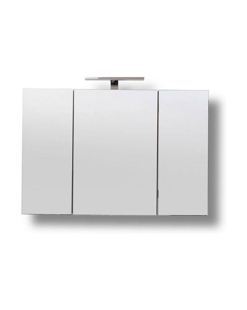 Καθρέφτης OMEGA 100. Πρόσοψη καθρέφτη με τρεις πόρτες και δύο χώρους αποθήκευσης για την τοποθέτηση αντικειμένων καθημερινής χρήσης. Συνδυάζεται με φωτιστικό LED 5 Watt IP44, το οποίο αντιστοιχεί σε λάμπα πυρακτώσεως 60 Watt (δεν περιλαμβάνεται).