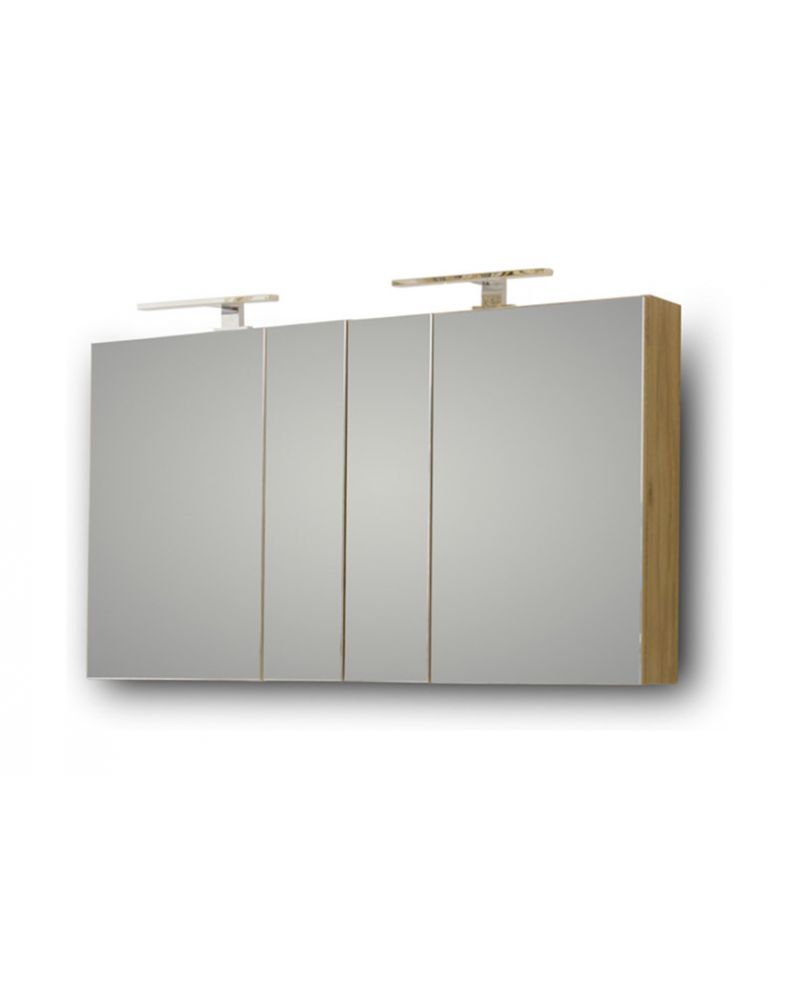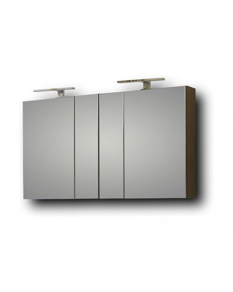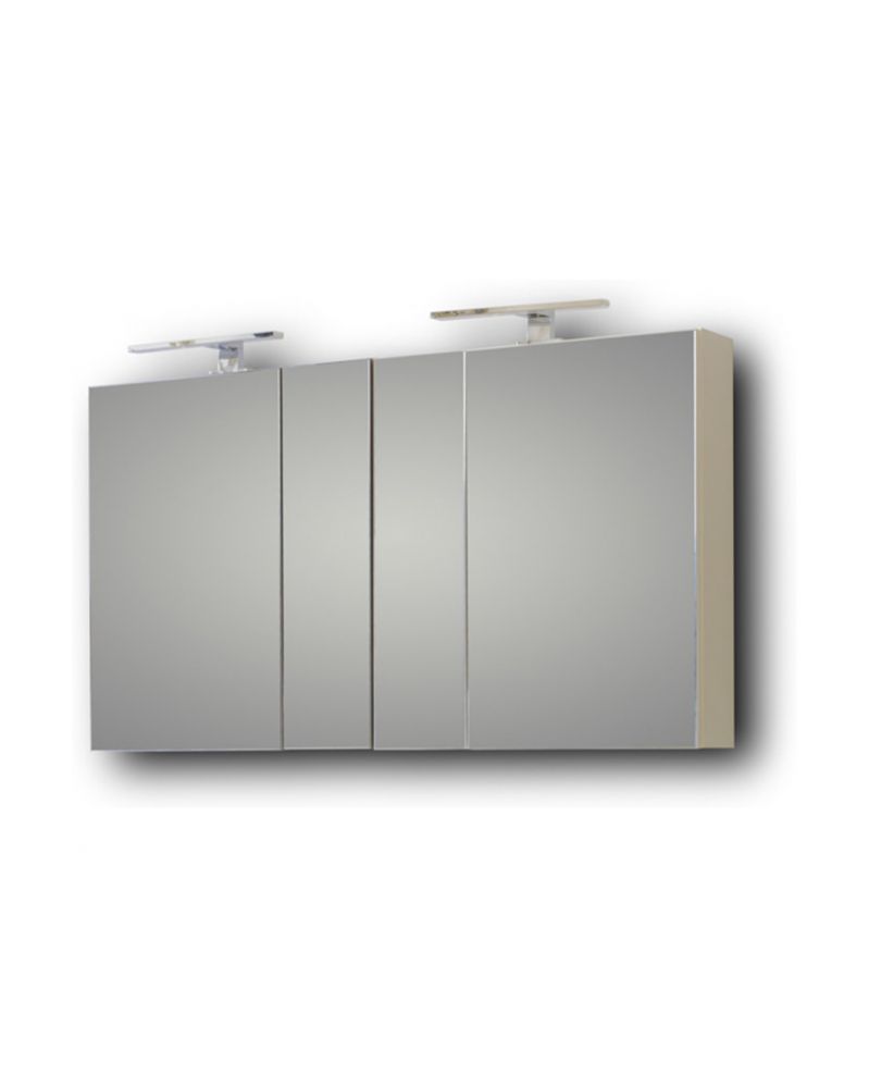 Καθρέφτης OMEGA WHITE 120. Πρόσοψη καθρέφτη με τέσσερις πόρτες και δύο χώρους αποθήκευσης για την τοποθέτηση αντικειμένων καθημερινής χρήσης. Συνδυάζεται με φωτιστικό LED 5 Watt IP44, το οποίο αντιστοιχεί σε λάμπα πυρακτώσεως 60 Watt (δεν περιλαμβάνεται).